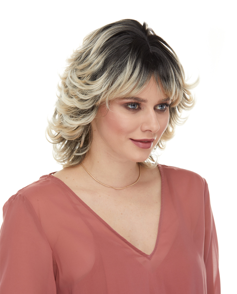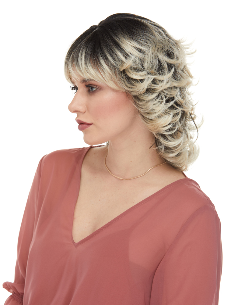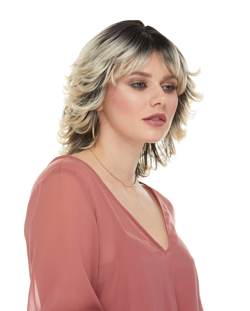 A SHOULDER LENGTH, SPUNKY WIG WITH FEATHERED LAYERS ALL AROUND TOPPED OFF WITH FRINGES.