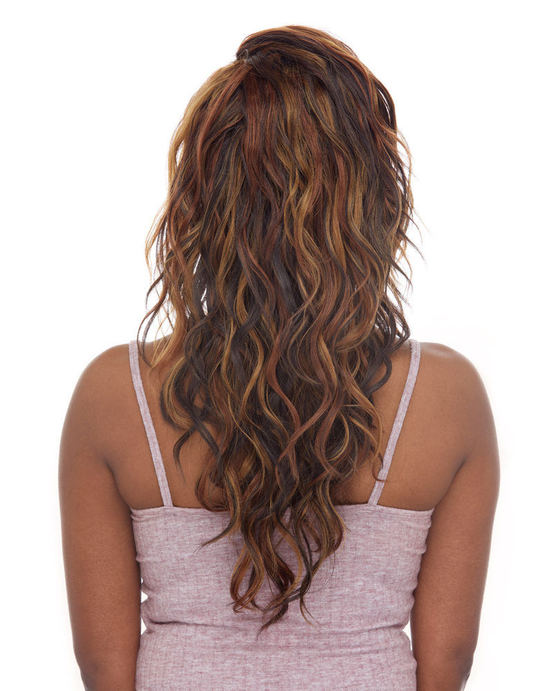 DO YOU WANT TOUSLED JUST-ROLLED-OUT-OF-BED LOOK, THESE BEACHY WAVES ARE PEFECTION IN THIS HEAT FRIENDLY HEADBAND WIG WITH VELCRO CLOSURE AT THE NAPE AND A COMB AT THE TOP AND BOTTOM OF THE WIG TO KEEP IT SECURE.