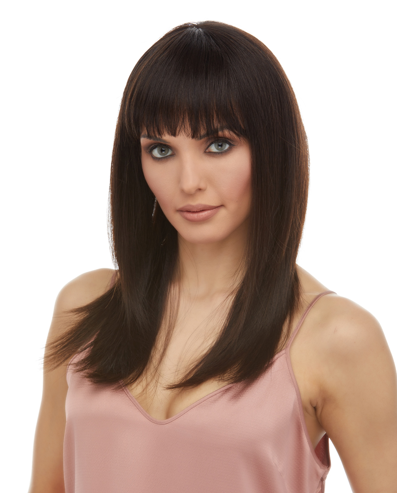 A SEXY MID LENGTH STRAIGHT CUT WITH BLUNTLY CUT BANGS.