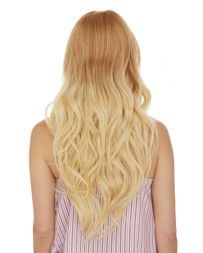 A DEEP CENTER PARTED WIG WITH LONG TOUSLED BEACH WAVES.