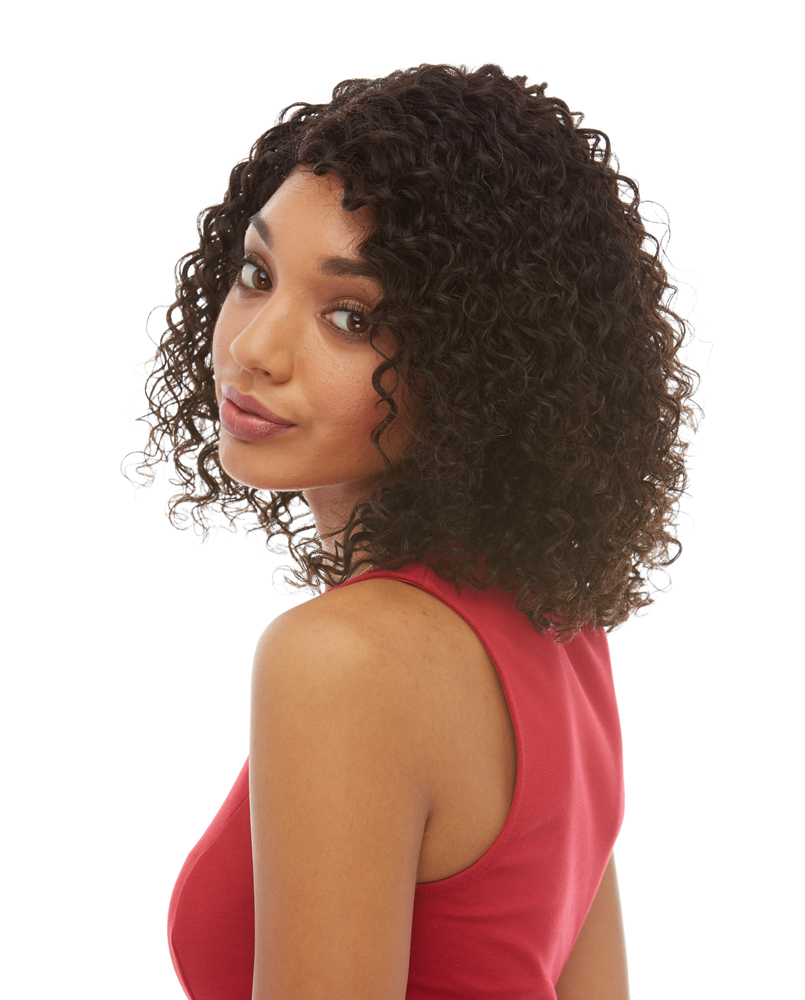 A SHOULDER LENGTH STYLE WITH FUN, TIGHT SPIRAL CURLS AND A NATURAL SIDE PART.