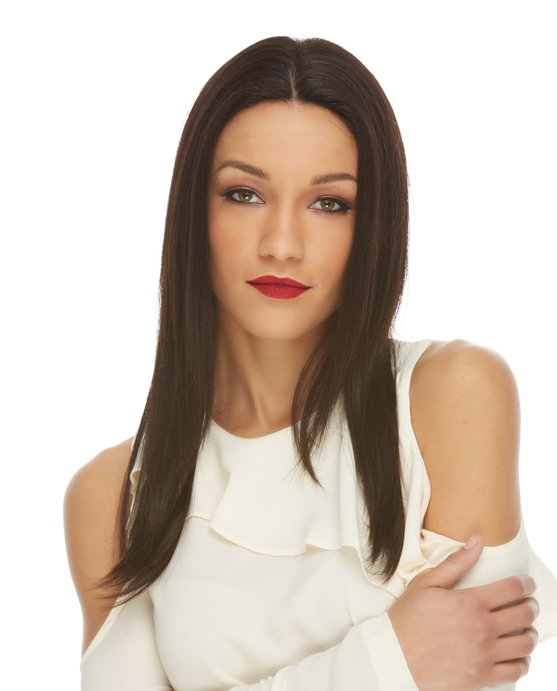 ELEGANCE AND SOPHISTICATION EXUDES FROM THIS LONG CHIC STRAIGHT HAIRSTYLE WITH RAZOR CUT LAYERS. IT HAS A 4″ X 4″ SILK BASE WHICH OFFERS THE VERSATILITY OF PARTING THE HAIR WHERE YOU WANT.