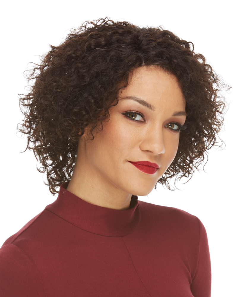 A SHORT BOB BOLDLY LAYERED WITH EXTREMELY TIGHT CURLS AND PARTED TO THE SIDE.