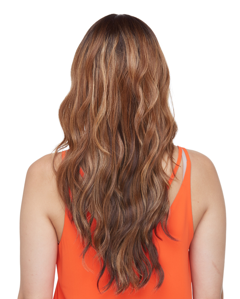 THIS EASY STYLE HAS LONG LAYERS OF BIG WAVES AND A FULL BANG SWEPT TO THE SIDE. IT ALSO FEATURES A LARGER CAP SIZE.
