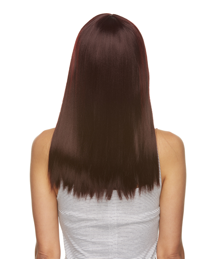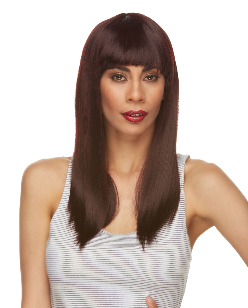 ULTRA CHIC AND ELEGANT MID LENGTH STYLE WITH FRINGES CUT BLUNTLY ACROSS. THIS WIG IS MADE OF A FIBER THAT GIVES YOU ULTRA LUSH REMY TEXTURE.