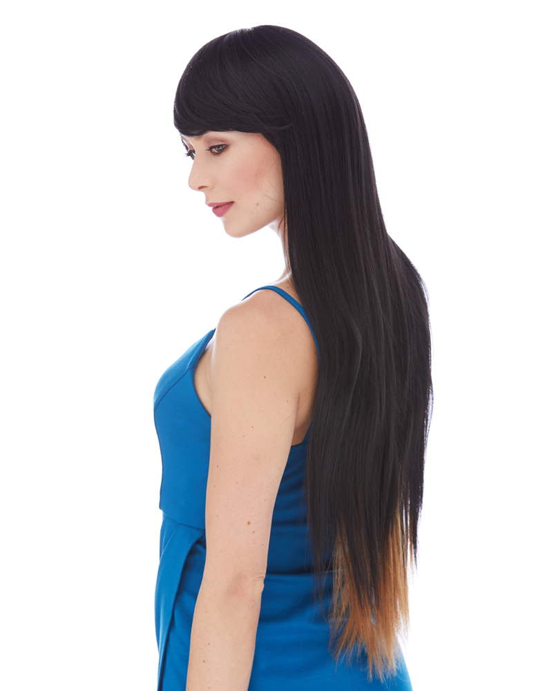 SEDUCTIVE LONG HAIR WITH LONG LAYERS AND BANGS PARTED TO THE SIDE.