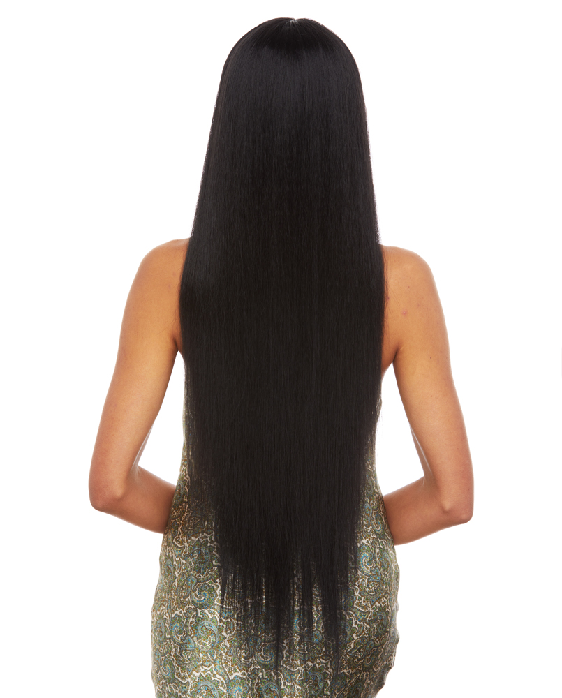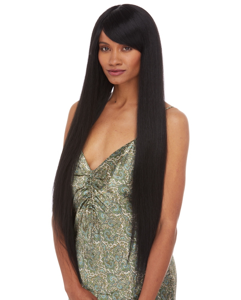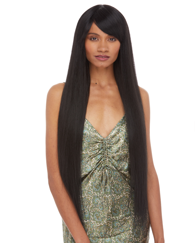 LONG, THICK TRESSES FALL DOWN TO YOUR HIPS, 38INCH LONG TO BE EXACT. HEAVY BANGS BALANCE OUT THIS SIREN OF A WIG.