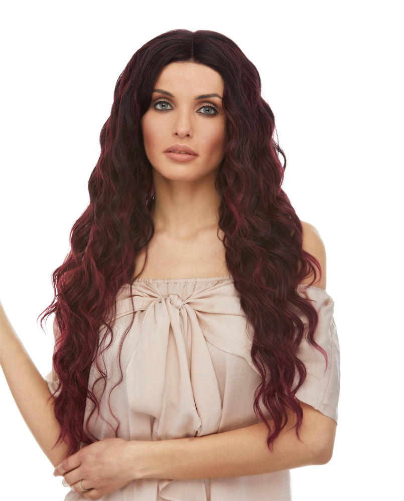 A LONG LACEFRONT WIG WITH A CENTER PART AND NATURAL LOOKING CURLS CUT TO A V SHAPE.