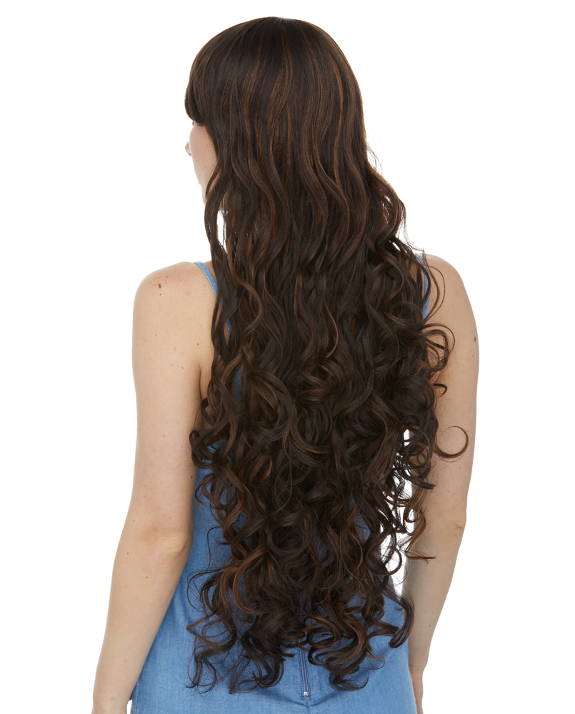 A LONGER VERSION OF JENNA, WITH BEAUTIFUL BARREL CURLS AND BANGS THAT ARE CUT TO YOUR TEMPLE. YOU’LL DEFINITELY TURN HEADS WITH THIS MUCH HAIR!