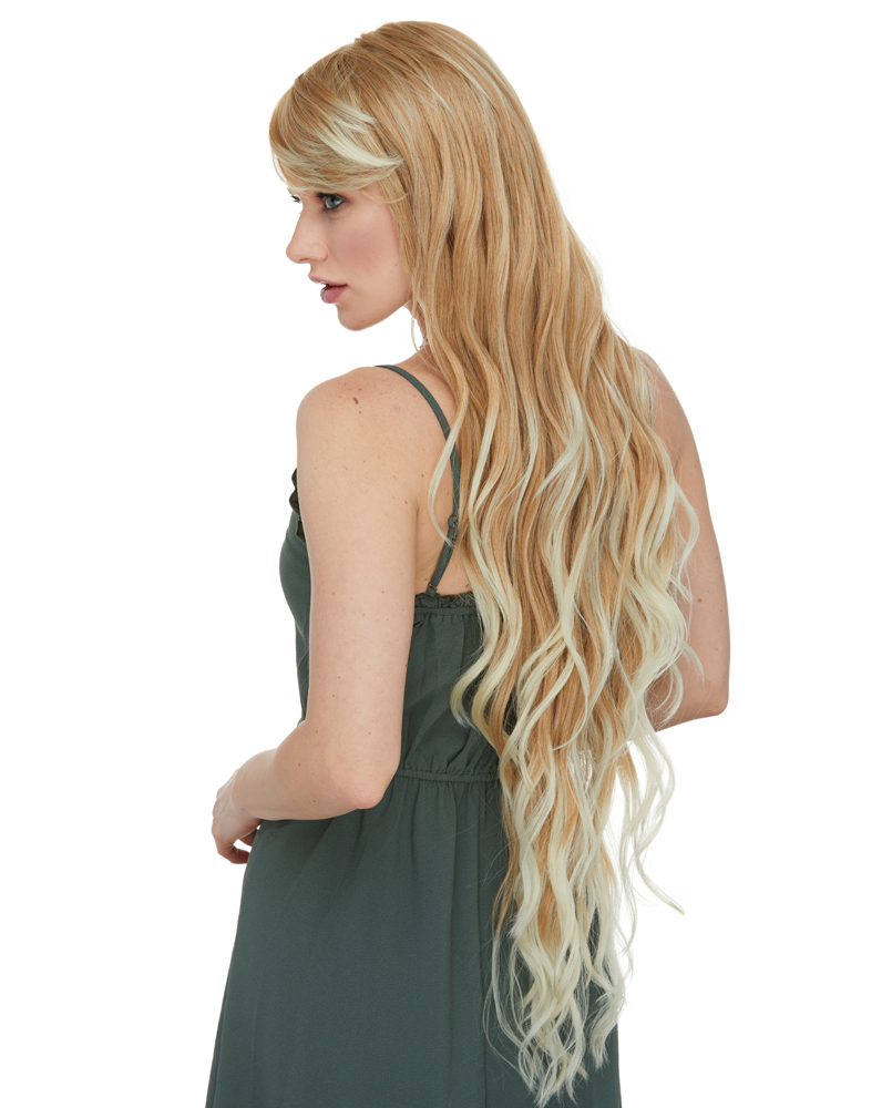LONG TOUSLED WAVES WITH LAYERED TRESSES THAT REACH PAST YOUR HIPS TOPPED OFF WITH THICK FRINGES. THIS STYLE IS NOT FOR THE MEEK, BUT FOR THE BOLD AND BEAUTIFUL.